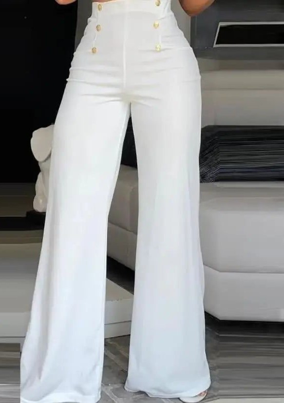 + Free ShippingHigh-waisted trousers, white wide-leg pants, gold button details, elegant trousers, tailored fit, formal trousers, chic white pants, fashion for women, stylish bottoms, wide-leg trousers.