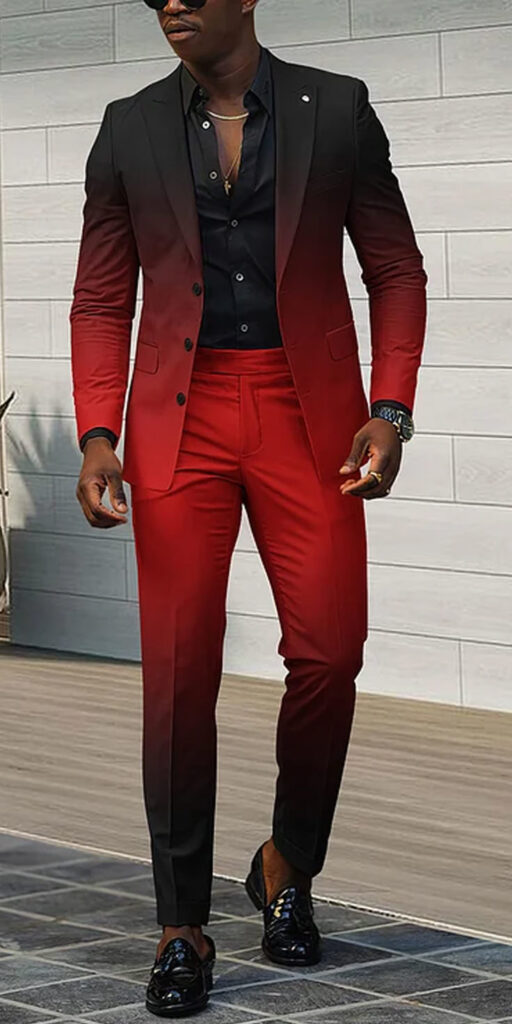Turn heads with this unique custom-made gradient . Transitioning from bold black to vibrant red, this ensemble redefines modern casual wear. Paired with a sleek black dress shirt and it’s perfect for making a statement at any casual yet sophisticated event. Step out in style and stand out from the crowd with this one-of-a-kind outfit.