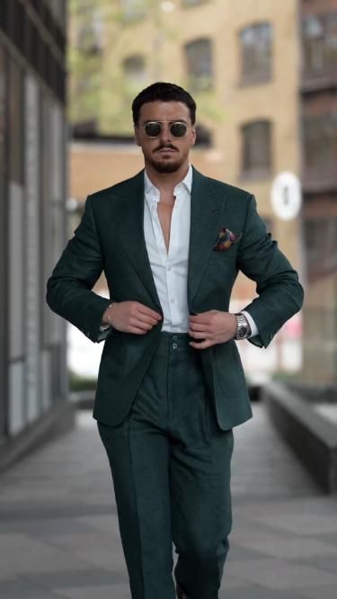 A custom-made olive green double-breasted suit . Crafted with precision and attention to detail, this suit ensures you stand out with sophistication and confidence.
