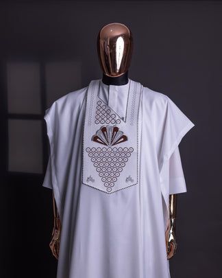 Celebrate culture with this elegant African attire, featuring intricate brown and gold embroidery. Perfect for special occasions, this ensemble showcases the artistry of African craftsmanship with timeless beauty.